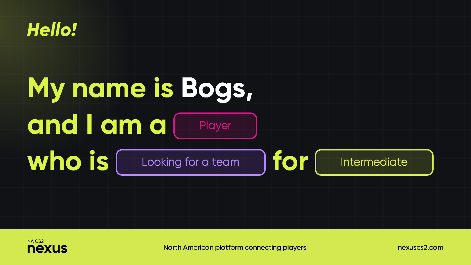 Previous experience playing collegiately. Mained awp in csgo have since switched to rifler but can still awp if needed. INT experience previously A+ ESEA faceit 9 nearly 10 but throwers got the best of me.
