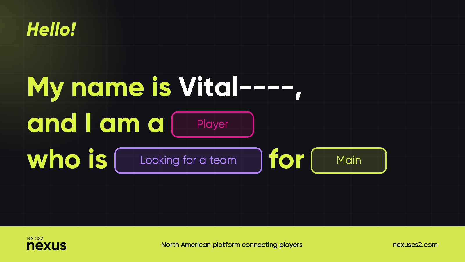 Yo, I'm Vital. I'm 27 and live in San Diego, but am used to playing on central servers so ping isn't really an issue. Have a bit over 3k hours into the game and am ~2200 elo. On T-side I generally prefer IGLing or support roles, can fill as needed. On CT, most comfortable spots are: (Mirage; A anchor/con) (Inferno; B anchor) (Dust; Spawns) (Vertigo; Mid) (Nuke; Ramp) (Ancient; A) (Anubis; Mid Rotate). Looking for a team that wants to get better, where practice isn't just pugging.